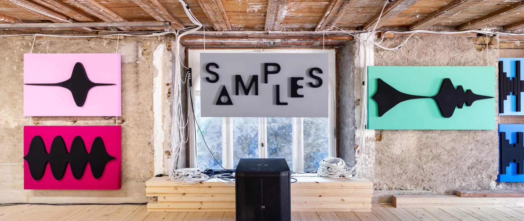 SAMPLES is an interactive musical installation that transforms the exhibition space into a giant music-making software. It consists of large, colorful, pop-inspired panels, each representing the waveform of different sound samples. As visitors approach the panels, they trigger sounds, creating an ever-evolving musical composition.